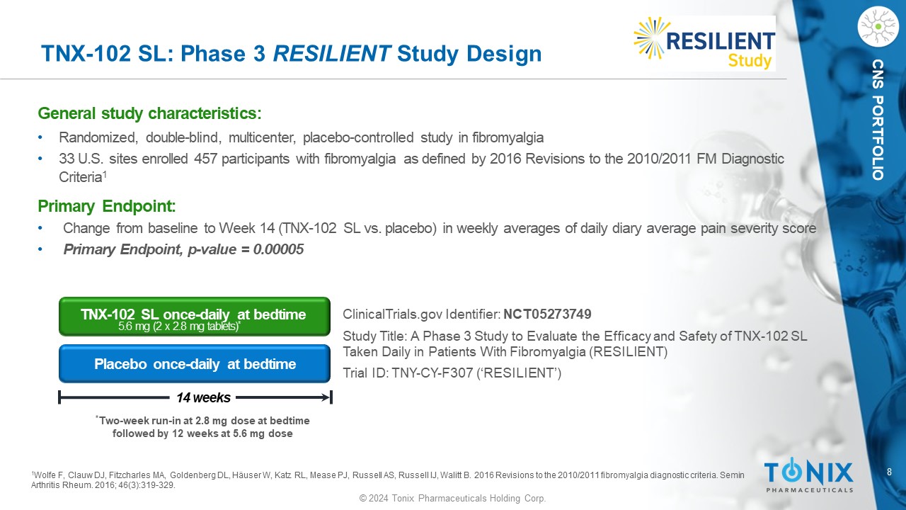 7 © 2024 Tonix Pharmaceuticals Holding Corp. CNS PORTFOLIO Fibromyalgia Program Status Fibromyalgia TNX - 102 SL Cyclobenzaprine Protectic ® Sublingual Tablets Positive 2 nd Phase 3 Topline Results Reported 4Q’23 1) P ositive Phase 3 study ( RELIEF ) reported – December 2020 1 2) Second Phase 3 study ( RALLY ) missed primary endpoint • Unexpected increase in adverse event - related discontinuations in both drug and placebo arms, potentially due to recruiting during COVID - 19 3) Positive 2 nd (c onfirmatory ) Phase 3 study ( RESILIENT ) reported – December 2023 1 Lederman et al., (2023) Arthritis Care & Research "Efficacy and Safety of TNX - 102 SL (Sublingual Cyclobenzaprine) for the Treatment of Fibromyalgia: Results From the RELIEF Trial ", doi : 10.1002/acr.25142. Epub ahead of print. PMID: 37165930. *TNX - 102 SL has not been approved for any indication. Next Steps: Pre - NDA meeting with FDA expected 1H’24 NDA filing expected 2H’24 FDA decision on NDA approval expected 2H’25