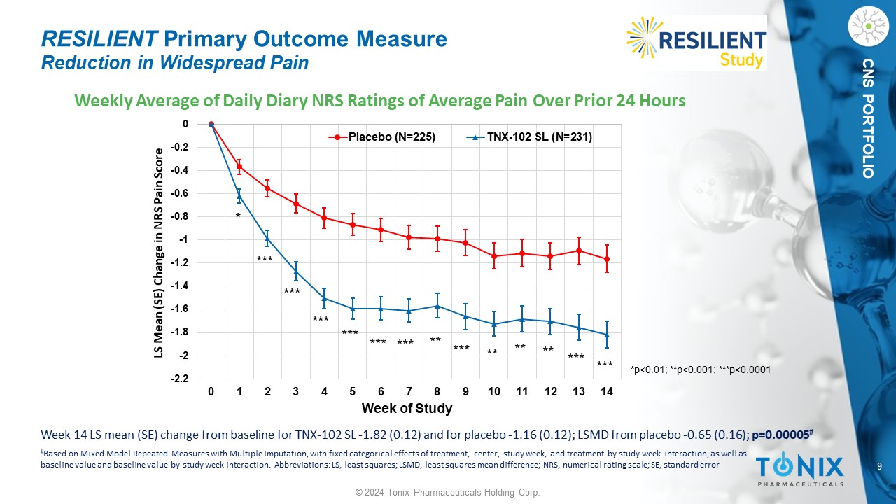 8 © 2024 Tonix Pharmaceuticals Holding Corp. CNS PORTFOLIO TNX - 102 SL: Phase 3 RESILIENT Study Design General s tudy c haracteristics: • Randomized, double - blind, multicenter, placebo - controlle d study in fibromyalgia • 33 U.S. sites enrolled 457 participants with fibromyalgia as defined by 2016 Revisions to the 2010/2011 FM Diagnostic C riteria 1 Primary Endpoint: • Change from baseline to Week 14 (TNX - 102 SL vs. placebo) in weekly averages of daily diary average pain severity score • Primary Endpoint, p - value = 0.00005 Placebo once - daily at bedtime TNX - 102 SL once - daily at bedtime 5.6 mg (2 x 2.8 mg tablets) * * Two - week run - in at 2.8 mg dose at bedtime followed by 12 weeks at 5.6 mg dose ClinicalTrials.gov Identifier: NCT05273749 Study Title: A Phase 3 Study to Evaluate the Efficacy and Safety of TNX - 102 SL Taken Daily in Patients With Fibromyalgia (RESILIENT) Trial ID: TNY - CY - F307 (‘RESILIENT’) 14 weeks 1 Wolfe F, Clauw DJ, Fitzcharles MA, Goldenberg DL, Häuser W, Katz RL, Mease PJ, Russell AS, Russell IJ, Walitt B. 2016 Revisions to the 2010/2011 fibromyalgia diagnostic criteria. Semin Arthritis Rheum. 2016; 46(3):319 - 329.