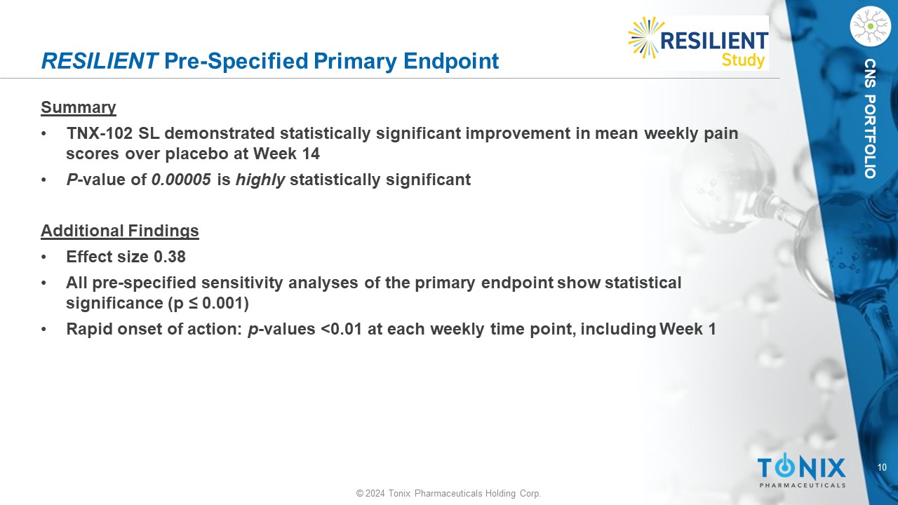 9 © 2024 Tonix Pharmaceuticals Holding Corp. CNS PORTFOLIO Weekly Average of Daily Diary NRS Ratings of Average Pain Over Prior 24 Hours RESILIENT Primary Outcome Measure Reduction in Widespread Pain -2.2 -2 -1.8 -1.6 -1.4 -1.2 -1 -0.8 -0.6 -0.4 -0.2 0 0 1 2 3 4 5 6 7 8 9 10 11 12 13 14 LS Mean (SE) Change in NRS Pain Score Week of Study Placebo (N=225) TNX-102 SL (N=231) * *** *** ** ** ** *** *** *** *** *** *** *** ** *p<0.01; **p<0.001; ***p<0.0001 Week 14 LS mean (SE) change from baseline for TNX - 102 SL - 1.82 (0.12) and for placebo - 1.16 (0.12); LSMD from placebo - 0.65 (0.1 6); p=0.00005 # # Based on Mixed Model Repeated Measures with Multiple Imputation, with fixed categorical effects of treatment, center, study w eek , and treatment by study week interaction, as well as baseline value and baseline value - by - study week interaction. Abbreviations: LS, least squares; LSMD, least squares mean differe nce; NRS, numerical rating scale; SE, standard error