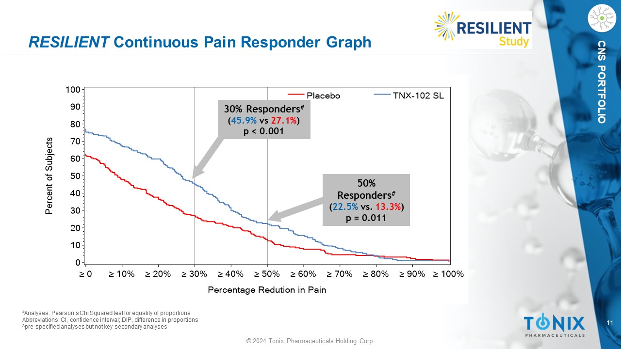 10 © 2024 Tonix Pharmaceuticals Holding Corp. CNS PORTFOLIO RESILIENT Pre - Specified Primary Endpoint Summary • TNX - 102 SL demonstrated statistically significant improvement in mean weekly pain scores over placebo at Week 14 • P - value of 0.00005 is highly statistically significant Additional Findings • Effect size 0.38 • All pre - specified sensitivity analyses of the primary endpoint show statistical significance (p ≤ 0.001) • Rapid onset of action: p - values <0.01 at each weekly time point, including Week 1