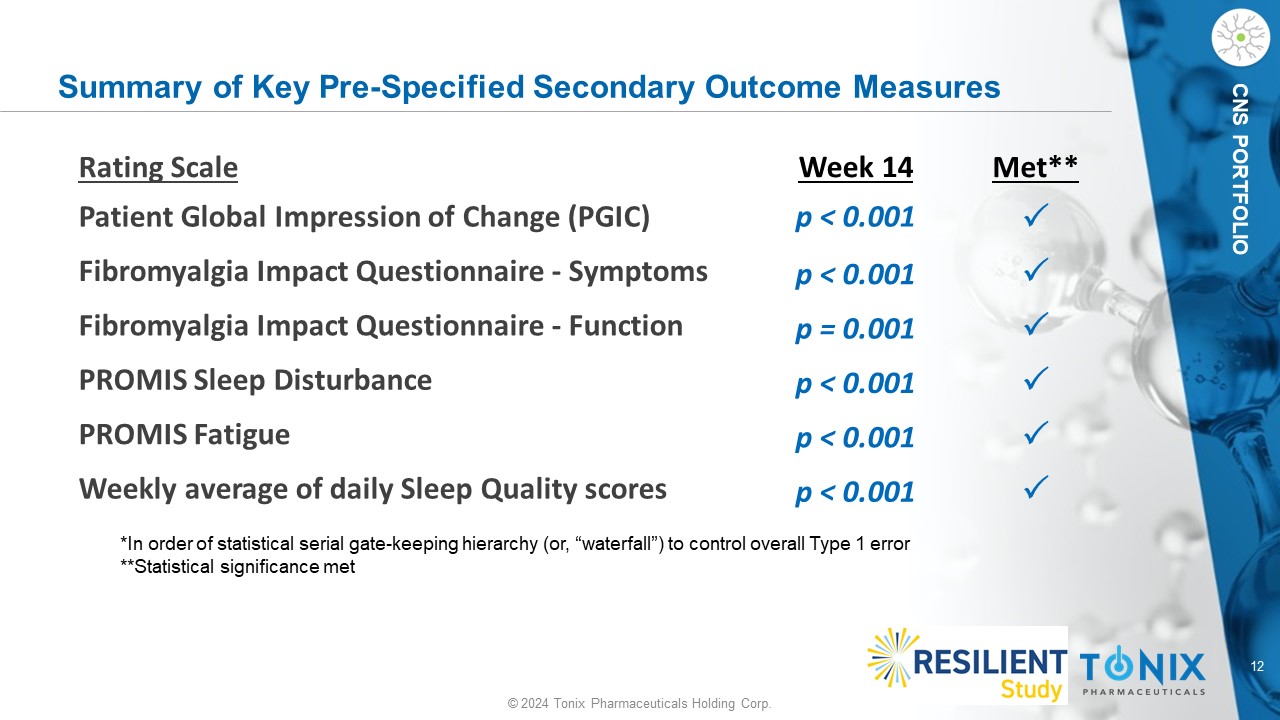11 © 2024 Tonix Pharmaceuticals Holding Corp. CNS PORTFOLIO RESILIENT Continuous Pain Responder Graph # Analyses: Pearson’s Chi Squared test for equality of proportions Abbreviations: CI, confidence interval; DIP, difference in proportions ^pre - specified analyses but not key secondary analyses P e r c e n t o f S u b j e c t s 0 10 20 30 40 50 60 70 80 90 100 Percentage Redution in Pain ≥ 0 ≥ 10% ≥ 20% ≥ 30% ≥ 40% ≥ 50% ≥ 60% ≥ 70% ≥ 80% ≥ 90% ≥ 100% Placebo TNX-102 SL 30% Responders # ( 45.9% vs 27.1% ) p < 0.001 50% Responders # ( 22.5% vs. 13.3% ) p = 0.011