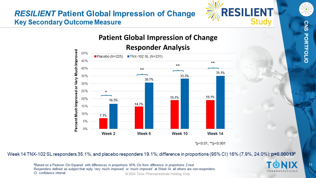 12 © 2024 Tonix Pharmaceuticals Holding Corp. CNS PORTFOLIO Summary of Key Pre - Specified Secondary Outcome Measures *In order of statistical serial gate - keeping hierarchy (or, “waterfall”) to control overall Type 1 error **Statistical significance met Met** Week 14 Rating Scale  p < 0.001 Patient Global Impression of Change (PGIC)  p < 0.001 Fibromyalgia Impact Questionnaire - Symptoms  p = 0.001 Fibromyalgia Impact Questionnaire - Function  p < 0.001 PROMIS Sleep Disturbance  p < 0.001 PROMIS Fatigue  p < 0.001 Weekly average of daily Sleep Quality scores