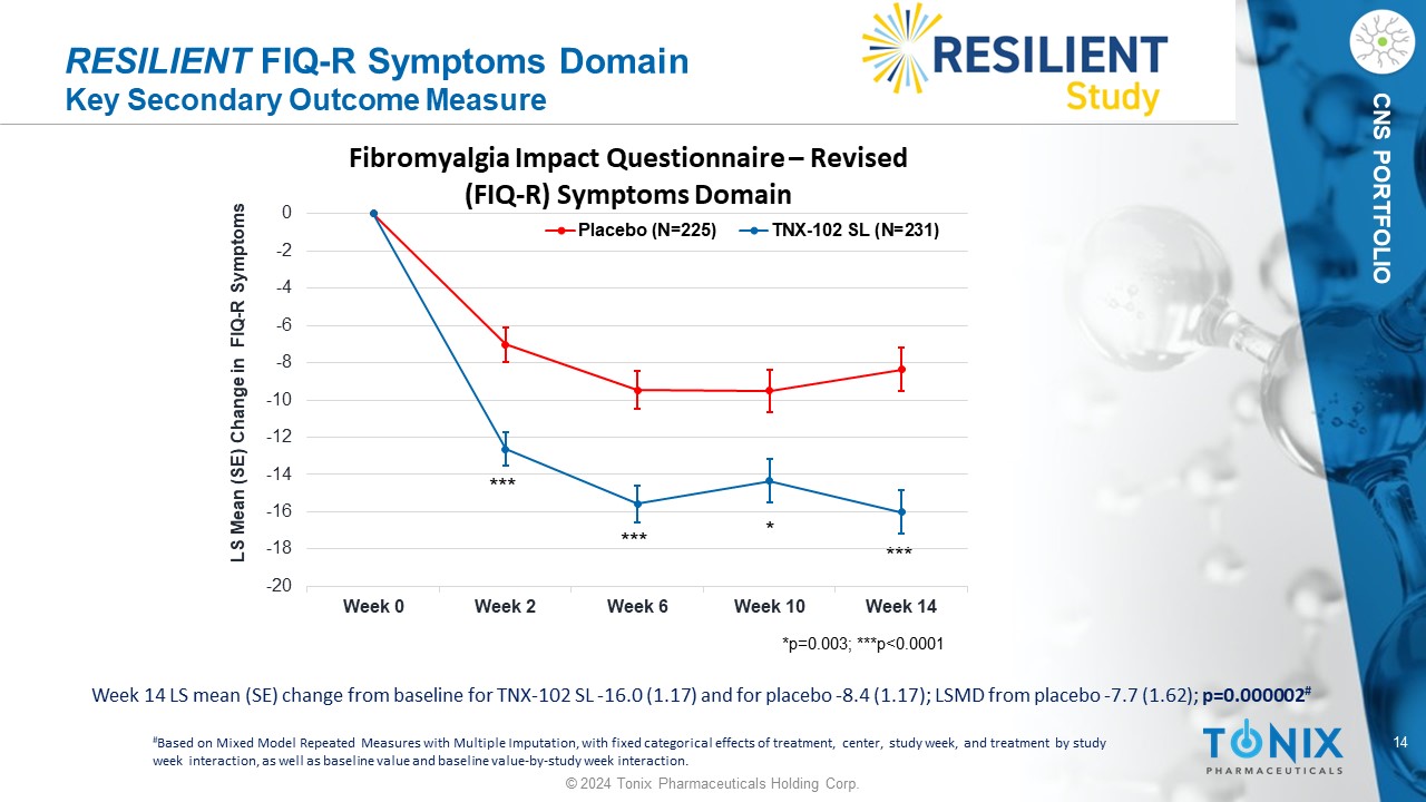 13 © 2024 Tonix Pharmaceuticals Holding Corp. CNS PORTFOLIO RESILIENT Patient Global Impression of Change Key Secondary Outcome Measure Week 14 TNX - 102 SL responders 35.1%, and placebo responders 19.1%; difference in proportions (95% CI) 16% (7.9%, 24.0%); p=0.00013 # # Based on a Pearson Chi - Squared with differences in proportions 95% CIs from difference in proportions Z - test Responders defined as subject that reply ‘very much improved’ or ‘much improved’ at Week 14; all others are non - responders CI, confidence interval 7.1% 14.7% 19.1% 19.1% 16.5% 30.7% 33.3% 35.1% 0% 5% 10% 15% 20% 25% 30% 35% 40% 45% 50% Week 2 Week 6 Week 10 Week 14 Patient Global Impression of Change Responder Analysis Placebo (N=225) TNX-102 SL (N=231) Percent Much Improved or Very Much Improved *p<0.01; **p<0.001 * ** ** **