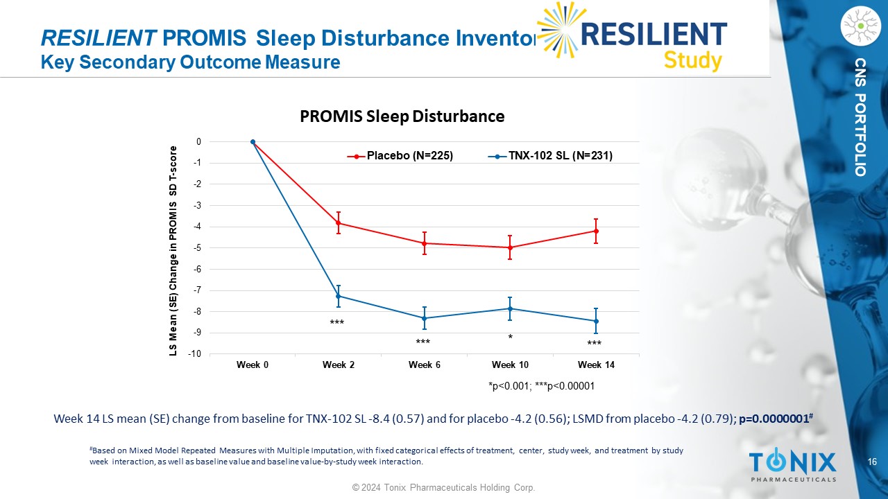 15 © 2024 Tonix Pharmaceuticals Holding Corp. CNS PORTFOLIO RESILIENT FIQ - R Function Domain Key Secondary Outcome Measure Week 14 LS mean (SE) change from baseline for TNX - 102 SL - 12.2 (1.19) and for placebo - 6.8 (1.21); LSMD from placebo - 5.4 (1.66) ; p=0.001 # # Based on Mixed Model Repeated Measures with Multiple Imputation, with fixed categorical effects of treatment, center, study w eek , and treatment by study week interaction, as well as baseline value and baseline value - by - study week interaction. -16 -14 -12 -10 -8 -6 -4 -2 0 Week 0 Week 2 Week 6 Week 10 Week 14 LS Mean (SE) Change in FIQ - R Function Fibromyalgia Impact Questionnaire – Revised (FIQ - R) Function Domain Placebo (N=225) TNX-102 SL (N=231) **p<0.01 ** ** **