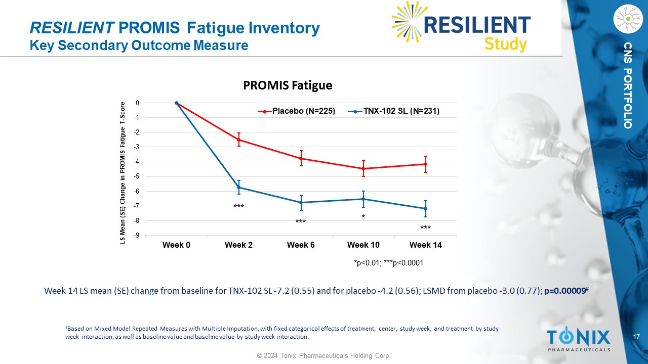 16 © 2024 Tonix Pharmaceuticals Holding Corp. CNS PORTFOLIO RESILIENT PROMIS Sleep Disturbance Inventory Key Secondary Outcome Measure Week 14 LS mean (SE) change from baseline for TNX - 102 SL - 8.4 (0.57) and for placebo - 4.2 (0.56); LSMD from placebo - 4.2 (0.79); p=0.0000001 # # Based on Mixed Model Repeated Measures with Multiple Imputation, with fixed categorical effects of treatment, center, study w eek , and treatment by study week interaction, as well as baseline value and baseline value - by - study week interaction. -10 -9 -8 -7 -6 -5 -4 -3 -2 -1 0 Week 0 Week 2 Week 6 Week 10 Week 14 LS Mean (SE) Change in PROMIS SD T - score PROMIS Sleep Disturbance Placebo (N=225) TNX-102 SL (N=231) *p<0.001; ***p<0.00001 * *** *** ***