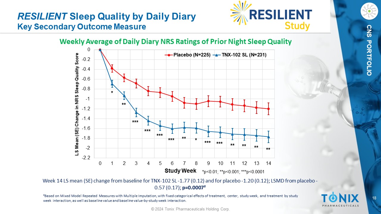 17 © 2024 Tonix Pharmaceuticals Holding Corp. CNS PORTFOLIO RESILIENT PROMIS Fatigue Inventory Key Secondary Outcome Measure Week 14 LS mean (SE) change from baseline for TNX - 102 SL - 7.2 (0.55) and for placebo - 4.2 (0.56); LSMD from placebo - 3.0 (0.77); p=0.00009 # # Based on Mixed Model Repeated Measures with Multiple Imputation, with fixed categorical effects of treatment, center, study w eek , and treatment by study week interaction, as well as baseline value and baseline value - by - study week interaction. -9 -8 -7 -6 -5 -4 -3 -2 -1 0 Week 0 Week 2 Week 6 Week 10 Week 14 LS Mean (SE) Change in PROMIS Fatigue T - Score PROMIS Fatigue Placebo (N=225) TNX-102 SL (N=231) *p<0.01; ***p<0.0001 * *** *** ***