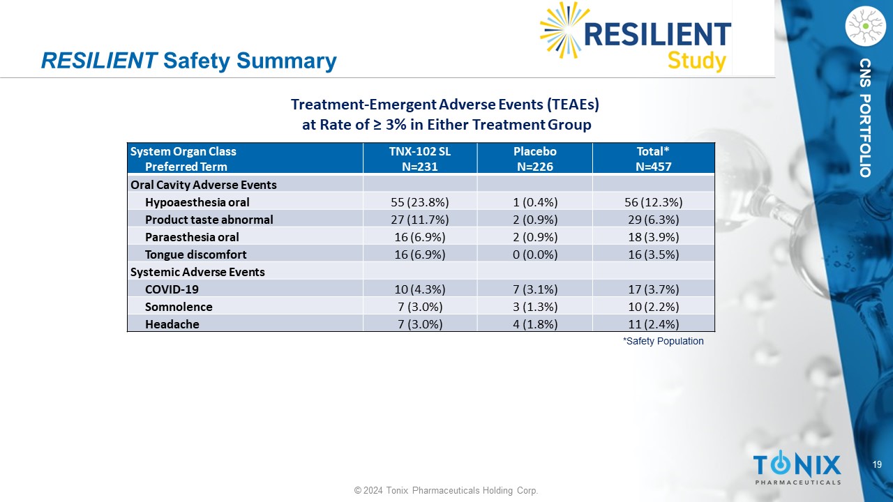 18 © 2024 Tonix Pharmaceuticals Holding Corp. CNS PORTFOLIO Week 14 LS mean (SE) change from baseline for TNX - 102 SL - 1.77 (0.12) and for placebo - 1.20 (0.12); LSMD from placebo - 0.57 (0.17); p=0.0007 # RESILIENT Sleep Quality by Daily Diary Key Secondary Outcome Measure Weekly Average of Daily Diary NRS Ratings of Prior Night Sleep Quality -2.2 -2 -1.8 -1.6 -1.4 -1.2 -1 -0.8 -0.6 -0.4 -0.2 0 0 1 2 3 4 5 6 7 8 9 10 11 12 13 14 LS Mean (SE) Change in NRS Sleep Quality Score Study Week Placebo (N=225) TNX-102 SL (N=231) *p<0.01; **p<0.001; ***p<0.0001 *** * ** ** * ** *** ** ** ** *** *** *** *** # Based on Mixed Model Repeated Measures with Multiple Imputation, with fixed categorical effects of treatment, center, study w eek , and treatment by study week interaction, as well as baseline value and baseline value - by - study week interaction.