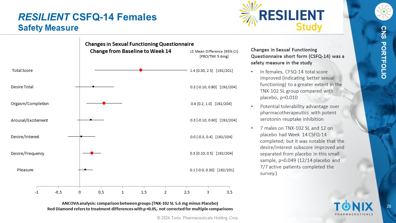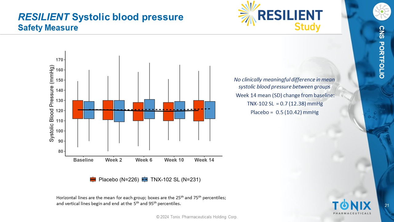 20 © 2024 Tonix Pharmaceuticals Holding Corp. CNS PORTFOLIO RESILIENT CSFQ - 14 Females Safety Measure Pleasure Desire/Frequency Desire/Interest Arousal/Excitement Orgasm/Completion Desire Total Total Score 0.1 [ - 0.0, 0.30] [192/201] 0.3 [0.10, 0.5] [192/204] 0.0 [ - 0.3, 0.4] [192/204] 0.3 [ - 0.10, 0.60] [192/204] 0.6 [0.2, 1.0] [192/204] 0.3 [ - 0.10, 0.80] [192/204] 1.4 [0.30, 2.5] [192/201] LS Mean Difference [95% CI] [PBO/TNX 5.6mg] -1 -0.5 0 0.5 1 1.5 2 2.5 3 3.5 ANCOVA analysis: comparison between groups (TNX - 102 SL 5.6 mg minus Placebo) Red Diamond refers to treatment differences with p <0.05, not corrected for multiple comparisons Changes in Sexual Functioning Questionnaire Change from Baseline to Week 14 Changes in Sexual Functioning Questionnaire short form (CSFQ - 14) was a safety measure in the study • In females, CFSQ - 14 total score improved (indicating better sexual functioning) to a greater extent in the TNX - 102 SL group compared with placebo, p=0.010 • Potential tolerability advantage over pharmacotherapeutics with potent serotonin reuptake inhibition • 7 males on TNX - 102 SL and 12 on placebo had Week 14 CSFQ - 14 completed; but it was notable that the desire/interest subscore improved and separated from placebo in this small sample, p=0.049 (12/14 placebo and 7/7 active patients completed the survey.)
