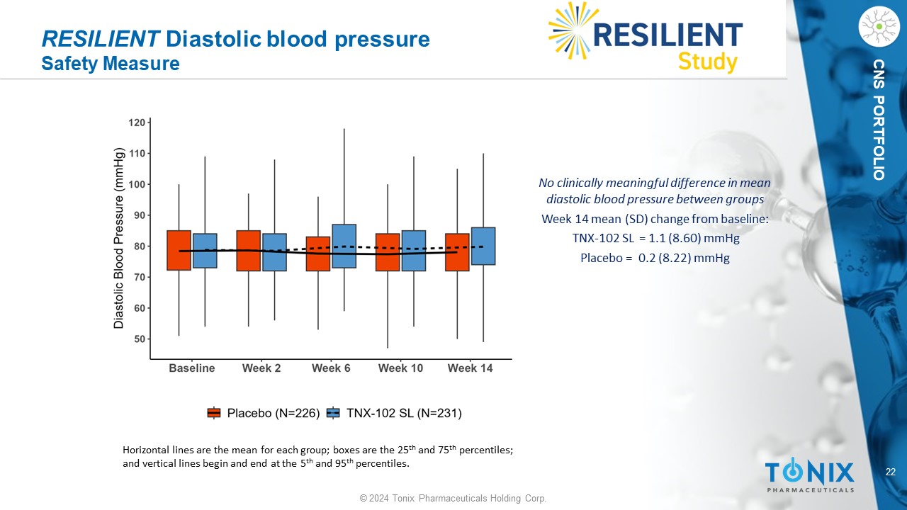 21 © 2024 Tonix Pharmaceuticals Holding Corp. CNS PORTFOLIO RESILIENT Systolic blood pressure Safety Measure No clinically meaningful difference in mean systolic blood pressure between groups Week 14 mean (SD) change from baseline: TNX - 102 SL = 0.7 (12.38) mmHg P lacebo = 0.5 (10.42) mmHg Horizontal lines are the mean for each group; boxes are the 25 th and 75 th percentiles; and vertical lines begin and end at the 5 th and 95 th percentiles.