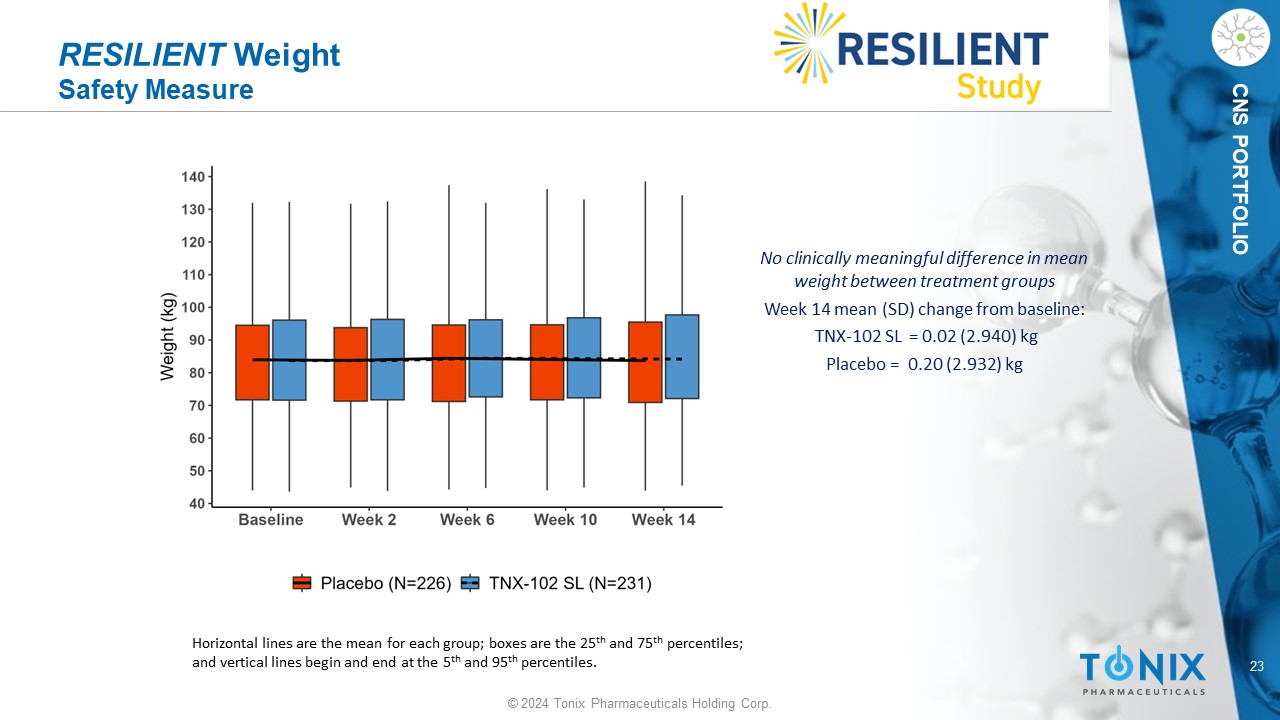 23 © 2024 Tonix Pharmaceuticals Holding Corp. CNS PORTFOLIO RESILIENT Weight Safety Measure No clinically meaningful difference in mean weight between treatment groups Week 14 mean (SD) change from baseline: TNX - 102 SL = 0.02 (2.94 0 ) kg P lacebo = 0.20 (2.932) kg Horizontal lines are the mean for each group; boxes are the 25 th and 75 th percentiles; and vertical lines begin and end at the 5 th and 95 th percentiles.