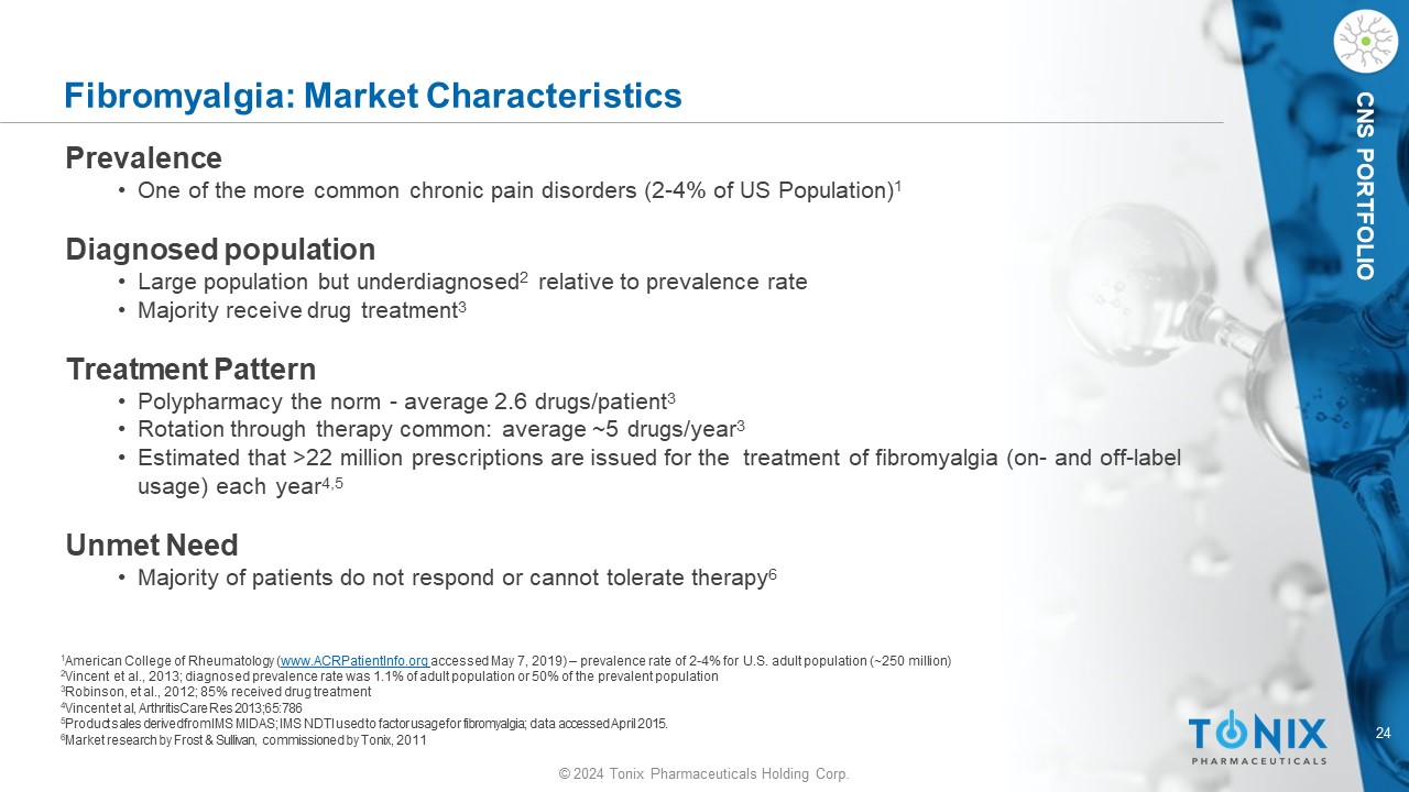 24 © 2024 Tonix Pharmaceuticals Holding Corp. CNS PORTFOLIO Fibromyalgia: Market Characteristics Prevalence • One of the more common chronic pain disorders (2 - 4% of US Population) 1 Diagnosed population • Large population but underdiagnosed 2 relative to prevalence rate • Majority receive drug treatment 3 Treatment Pattern • Polypharmacy the norm - average 2.6 drugs/patient 3 • Rotation through therapy common: average ~5 drugs/year 3 • Estimated that >22 million prescriptions are issued for the treatment of fibromyalgia (on - and off - label usage) each year 4,5 Unmet Need • Majority of patients do not respond or cannot tolerate therapy 6 1 American College of Rheumatology ( www.ACRPatientInfo.org accessed May 7, 2019) – prevalence rate of 2 - 4% for U.S. adult population (~250 million) 2 Vincent et al., 2013; diagnosed prevalence rate was 1.1% of adult population or 50% of the prevalent population 3 Robinson, et al., 2012; 85% received drug treatment 4 Vincent et al, Arthritis Care Res 2013;65:786 5 Product sales derived from IMS MIDAS; IMS NDTI used to factor usage for fibromyalgia; data accessed April 2015. 6 Market research by Frost & Sullivan, commissioned by Tonix , 2011