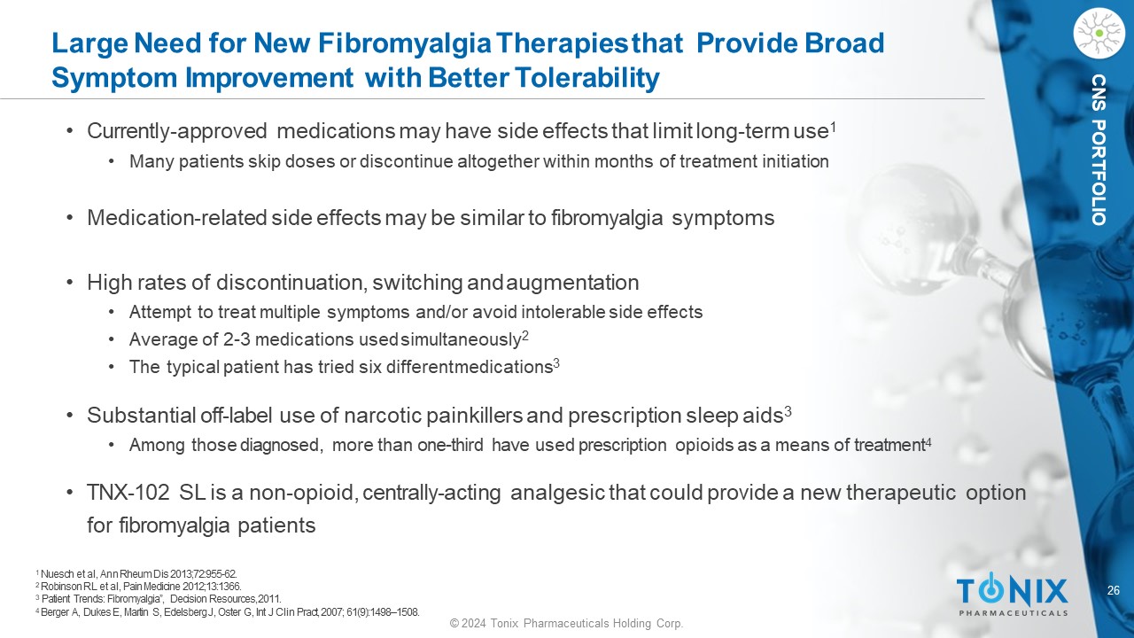 25 © 2024 Tonix Pharmaceuticals Holding Corp. CNS PORTFOLIO Fewer than Half of Those Treated for Fibromyalgia Receive Sustained Benefit from the Three FDA - Approved Drugs 1 Respond, but intolerant of side effects Do not respond 25% 35% 60% fa il ure rate 1 The three drugs with FDA approval for the treatment of fibromyalgia: Pregabalin (Lyrica); Duloxetine (Cymbalta); Milnacipran (Savella) 2 Market research by Frost & Sullivan, commissioned by Tonix (2011) • The treatment objective is to restore functionality and quality of life by broadly improving symptoms while avoiding significant side effects • The majority fail therapy due to lack of a response or poor tolerability 2 Treated Population