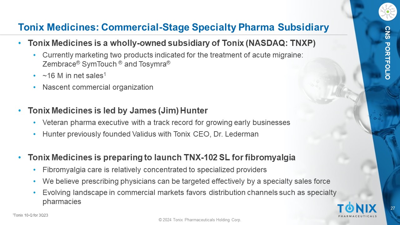 26 © 2024 Tonix Pharmaceuticals Holding Corp. CNS PORTFOLIO Large Need for New Fibromyalgia Therapies that Provide Broad Symptom Improvement with Better Tolerability • Currently - approved medications may have side effects that limit long - term use 1 • Many patients skip doses or discontinue altogether within months of treatment initiation • Medication - related side effects may be similar to fibromyalgia symptoms • High rates of discontinuation, switching and augmentation • Attempt to treat multiple symptoms and/or avoid intolerable side effects • Average of 2 - 3 medications used simultaneously 2 • The typical patient has tried six different medications 3 • Substantial off - label use of narcotic painkillers and prescription sleep aids 3 • Among those diagnosed, more than one - third have used prescription opioids as a means of treatment 4 • TNX - 102 SL is a non - opioid, centrally - acting analgesic that could provide a new therapeutic option for fibromyalgia patients 1 Nuesch et al, Ann Rheum Dis 2013;72:955 - 62. 2 Robinson RL et al, Pain Medicine 2012;13:1366. 3 Patient Trends: Fibromyalgia”, Decision Resources, 2011. 4 Berger A, Dukes E, Martin S, Edelsberg J, Oster G, Int J Clin Pract , 2007; 61(9):1498 – 1508.