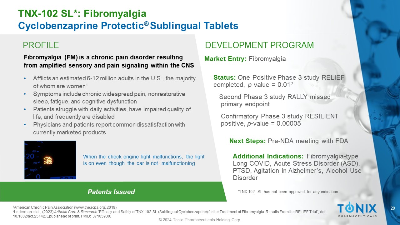 28 © 2024 Tonix Pharmaceuticals Holding Corp. CNS PORTFOLIO TNX - 102 SL: Patents and Patent Applications • U.S. Composition:* • A 75:25 cyclobenzaprine HCl - mannitol eutectic (dependent claims add a basifying agent). • 5 US Patents (Expire November 2034) • 1 Pending US Application (Would expire November 2034) • A composition of a cyclobenzaprine HCl and a basifying agent suitable for sublingual absorption. • 1 Pending US Application (Would e xpire June 2033) • U.S. Methods of Use* (Specific Indications): • Fibromyalgia • Pain, Sleep Disturbance, Fatigue • 1 Pending US Application (Would e xpire December 2041) • Early Onset Response • 1 Pending US Provisional Application (Would e xpire December 2044) • Depressive Symptoms • 1 Pending US Application (Would e xpire March 2032) • Sexual Dysfunction • 1 Pending US Application (Would expire October 2041) • PASC • 1 Pending US Application (Would e xpire June 2043) • PTSD • 1 US Patent ( Expires November 2030) • Agitation (Dementia) • 1 US Patent ( Expires December 2038) • 1 Pending US Application (Would expire December 2038) • Alcohol Use Disorder • 1 Pending US Application (Would e xpire November 2041) • Foreign Filings • Corresponding foreign patents have been filed and some have issued: • Composition (25 patents, 3 allowed applications, 16 pending applications) • Methods of Use (11 patents, 54 pending applications) *US Patents: Issued: US Patent Nos. 9,636,408; 9,956,188; 10,117,936; 10,864,175; 11,839,594; 9,918,948; 11,826,321. Pending: US Patent Application Nos. 13/918,692; 18/385,468; 13/412,571; 18/265,525; 63/612,352; 18/382,262; 18/037,815; 17/226,058; 18/212,500.