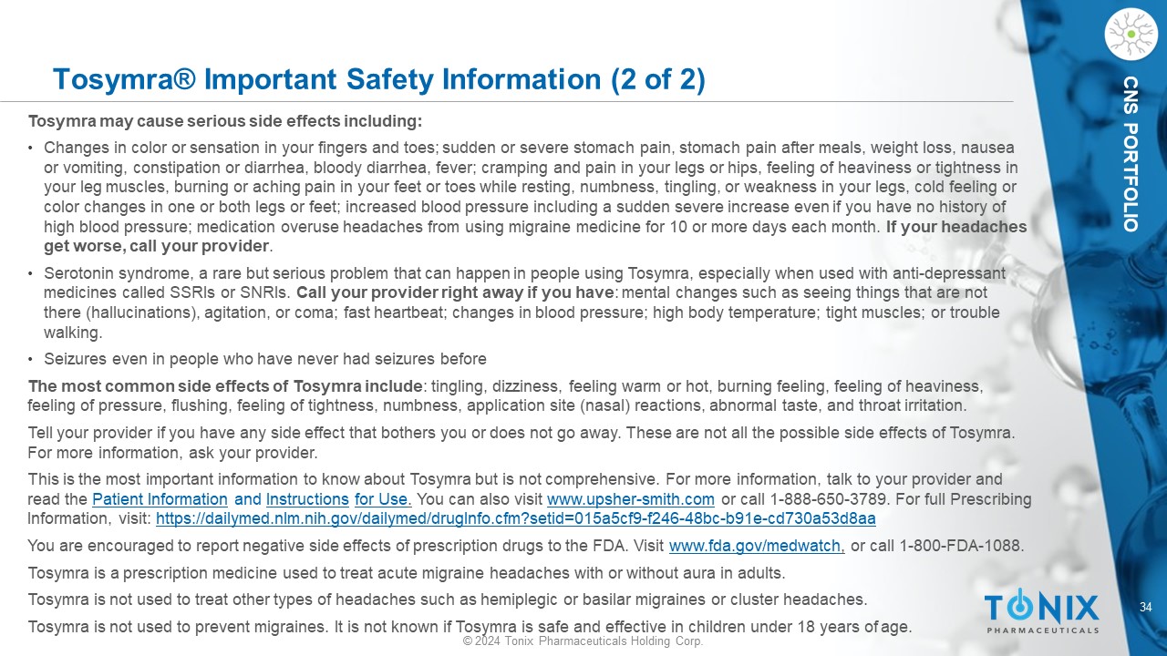 33 © 2024 Tonix Pharmaceuticals Holding Corp. CNS PORTFOLIO Tosymra® Important Safety Information (1 of 2) Tosymra® can cause serious side effects, including heart attack and other heart problems, which may lead to death. Stop Tosymra and get emergency medical help if you have any signs of heart attack: • D iscomfort in the center of your chest that lasts for more than a few minutes or goes away and comes back ; severe tightness, pain, pressure, or heaviness in your chest, throat, neck, or jaw ; pain or discomfort in your arms, back, neck, jaw, or stomach ; shortness of breath with or without chest discomfort; breaking out in a cold sweat ; nausea or vomiting ; feeling lightheaded Tosymra is not for people with risk factors for heart disease (high blood pressure or cholesterol, smoking, overweight, diabetes, family history of heart disease) unless a heart exam is done and shows no problem. Do not use Tosymra if you have: • H istory of heart problems ; narrowing of blood vessels to your legs, arms, stomach, or kidney (peripheral vascular disease) ; uncontrolled high blood pressure ; severe liver problems ; hemiplegic or basilar migraines. If you are not sure if you have these, ask your healthcare provider. • H ad a stroke, transient ischemic attacks (TIAs), or problems with blood circulation ; taken any of the following medicines in the last 24 hours: almotriptan , eletriptan , frovatriptan , naratriptan, rizatriptan, ergotamines , or dihydroergotamine. Ask your provider if you are not sure if your medicine is listed above • are taking certain antidepressants, known as monoamine oxidase (MAO) - A inhibitors or it has been 2 weeks or less since you stopped taking a MAO - A inhibitor . A sk your provider for a list of these medicines if you are not sure • A n allergy to sumatriptan or any ingredient in Tosymra Tell your provider about all of your medical conditions and medicines you take, including vitamins and supplements. Tosymra can cause dizziness, weakness, or drowsiness. If so, do not drive a car, use machinery, or do anything where you need to be alert.