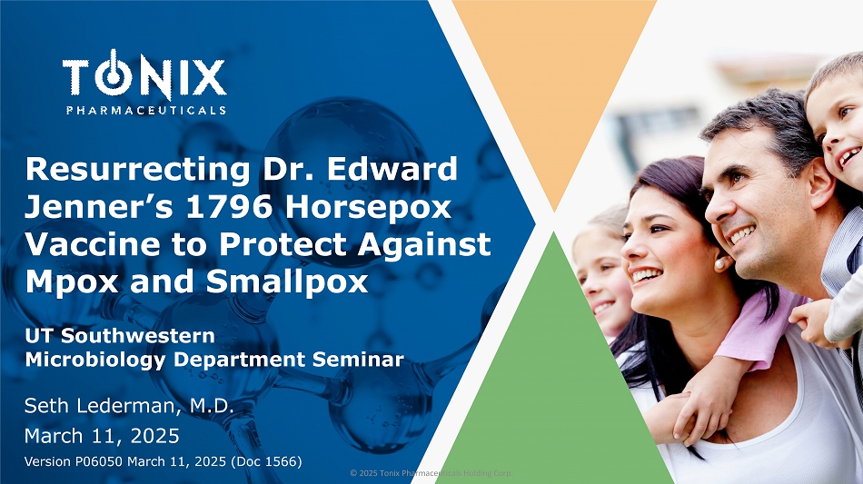 © 2025 Tonix Pharmaceuticals Holding Corp. Resurrecting Dr. Edward Jenner’s 1796 Horsepox Vaccine to Protect Against Mpox and Smallpox UT Southwestern Microbiology Department Seminar Seth Leder man, M.D. March 11, 2025 Version P06050 March 11, 2025 (Doc 1566)