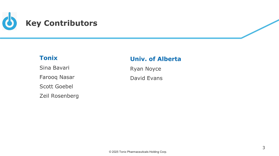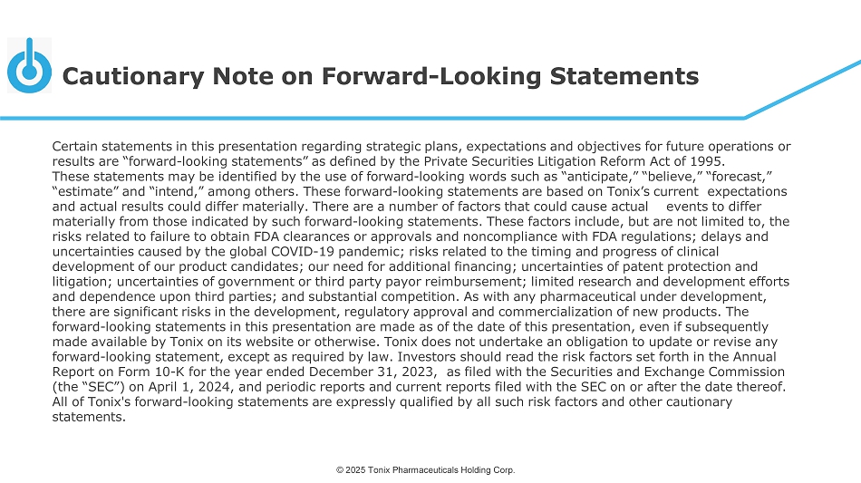 © 2025 Tonix Pharmaceuticals Holding Corp. Cautionary Note on Forward - Looking Statements Certain statements in this presentation regarding strategic plans, expectations and objectives for future operations or results are “forward - looking statements” as defined by the Private Securities Litigation Reform Act of 1995. These statements may be identified by the use of forward - looking words such as “anticipate,” “believe,” “forecast,” “estimate” and “intend,” among others. These forward - looking statements are based on Tonix’s current expectations and actual results could differ materially. There are a number of factors that could cause actual events to differ materially from those indicated by such forward - looking statements. These factors include, but are not limited to, the risks related to failure to obtain FDA clearances or approvals and noncompliance with FDA regulations; delays and uncertainties caused by the global COVID - 19 pandemic; risks related to the timing and progress of clinical development of our product candidates; our need for additional financing; uncertainties of patent protection and litigation; uncertainties of government or third party payor reimbursement; limited research and development efforts and dependence upon third parties; and substantial competition. As with any pharmaceutical under development, there are significant risks in the development, regulatory approval and commercialization of new products. The forward - looking statements in this presentation are made as of the date of this presentation, even if subsequently made available by Tonix on its website or otherwise. Tonix does not undertake an obligation to update or revise any forward - looking statement, except as required by law. Investors should read the risk factors set forth in the Annual Report on Form 10 - K for the year ended December 31, 202 3 , as filed with the Securities and Exchange Commission (the “SEC”) on April 1 , 202 4 , and periodic reports and current reports filed with the SEC on or after the date thereof. All of Tonix's forward - looking statements are expressly qualified by all such risk factors and other cautionary statements.