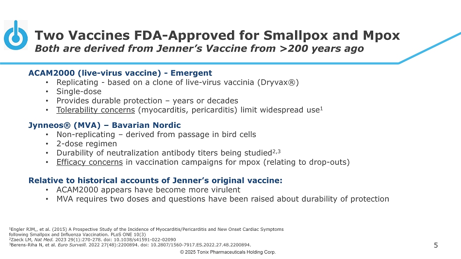 © 2025 Tonix Pharmaceuticals Holding Corp. 4 In 1798, Edward Jenner Described Vaccination with the “Virus” that Causes Cow Pox for Preventing Smallpox Jenner, E. (1798) “ The Inquiry ” • Full title: “An Inquiry Into the Causes and Effects of the Variolae Vaccinae , a Disease Discovered in Some of the Western Counties of England, Particularly Gloucestershire, and Known by the Name of the Cow Pox” Cow Pox was a mild illness in humans that provided protection (later known as immunity ) • “Cowpox” was the name of a disease in cows that could transfer to humans and cause sores Jenner predicted eradication of smallpox • In 1801, Jenner wrote "the annihilation of the smallpox, the most dreadful scourge of the human species, must be the final result of this practice.“ Mpox benefit • When vaccination for smallpox was widely practiced, mpox was kept out of the human population