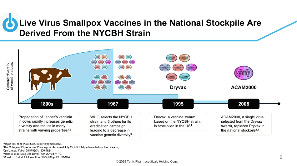 © 2025 Tonix Pharmaceuticals Holding Corp. Two Vaccines FDA - Approved for Smallpox and Mpox Both are derived from Jenner’s Vaccine from >200 years ago ACAM2000 (live - virus vaccine) - Emergent • Replicating - based on a clone of live - virus vaccinia ( Dryvax ®) • Single - dose • Provides durable protection – years or decades • Tolerability concerns (myocarditis, pericarditis) limit widespread use 1 Jynneos ® (MVA) – Bavarian Nordic • Non - replicating – derived from passage in bird cells • 2 - dose regimen • Durability of neutralization antibody titers being studied 2,3 • Efficacy concerns in vaccination campaigns for mpox (relating to drop - outs) Relative to historical accounts of Jenner’s original vaccine : • ACAM2000 appears have become more virulent • MVA requires two doses and questions have been raised about durability of protection 1 Engler RJM,, et al. (2015) A Prospective Study of the Incidence of Myocarditis/Pericarditis and New Onset Cardiac Symptoms following Smallpox and Influenza Vaccination. PLoS ONE 10(3) 2 Zaeck LM, Nat Med. 2023 29(1):270 - 278. doi : 10.1038/s41591 - 022 - 02090 3 Berens - Riha N, et al. Euro Surveill . 2022 27(48):2200894. doi : 10.2807/1560 - 7917.ES.2022.27.48.2200894. 5
