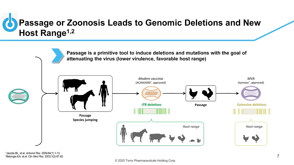 © 2025 Tonix Pharmaceuticals Holding Corp. Live Virus Smallpox Vaccines in the National Stockpile Are Derived From the NYCBH Strain 6 Propagation of Jenner’s vaccinia in cows rapidly increases genetic diversity and results in many strains with varying properties 1,2 1800s WHO selects the NYCBH strain and 3 others for its eradication campaign, leading to a decrease in vaccine genetic diversity 3 1967 Dryvax Dryvax, a vaccine swarm based on the NYCBH strain, is stockpiled in the US 4 1995 ACAM2000 ACAM2000, a single virus selected from the Dryvax swarm, replaces Dryvax in the national stockpile 4,5 2008 Genetic diversity of vaccine stocks 1 Noyce RS, et al. PLoS One. 2018;13(1):e0188453. 2 The College of Physicians of Philadelphia. Accessed July 15, 2021. https://www.historyofvaccines.org 3 Qin L, et al. J Virol. 2015;89(3):1809 - 1824. 4 Nalca A, et al. Drug Des Devel Ther. 2010;4:71 - 79. 5 Monath TP, et al. Int J Infect Dis. 2004;8 Suppl 2:S31 - S44.
