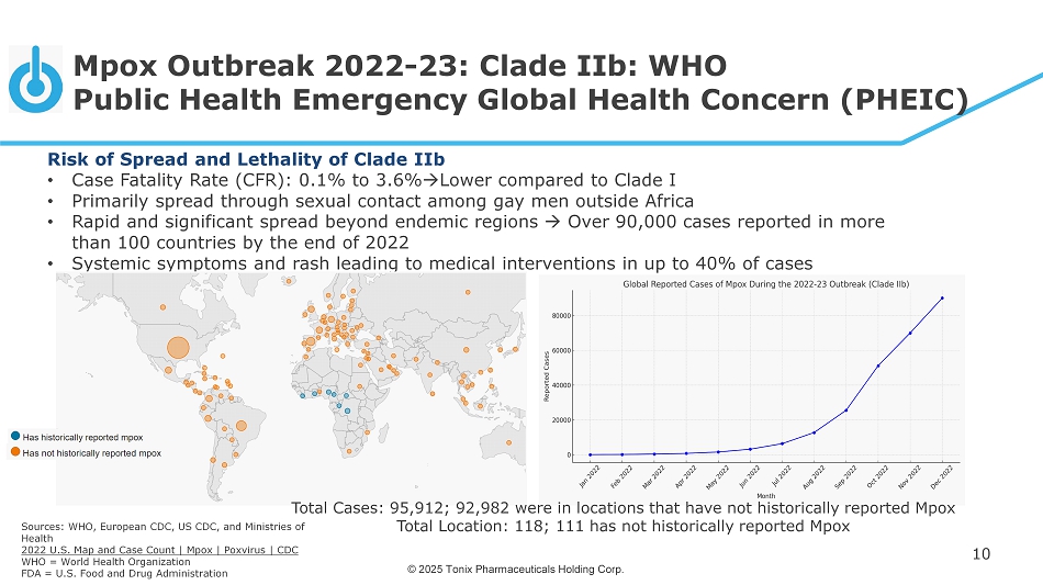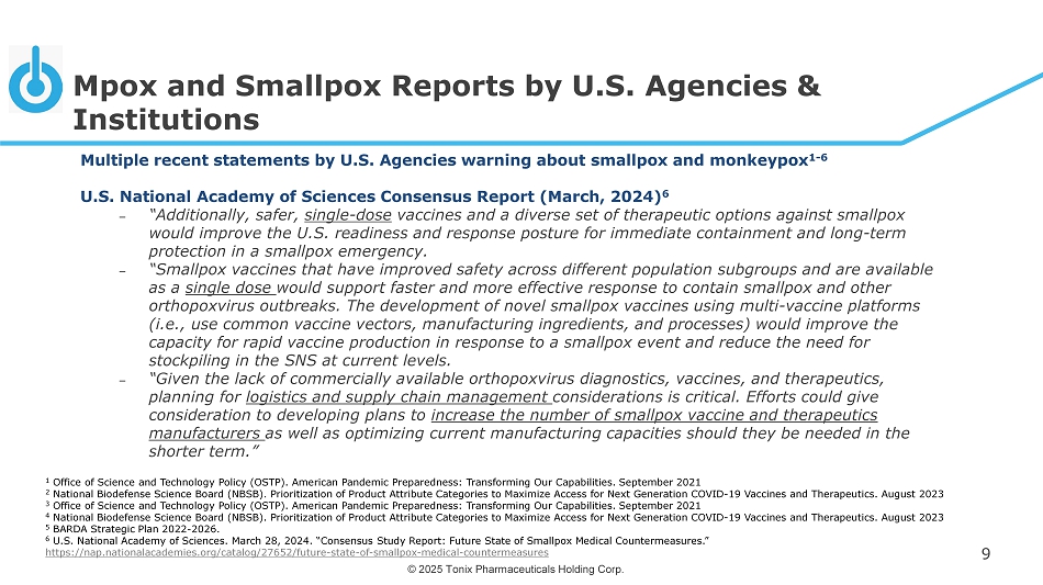 © 2025 Tonix Pharmaceuticals Holding Corp. Mpox and Smallpox Reports by U.S. Agencies & Institutions Multiple recent statements by U.S. Agencies warning about smallpox and monkeypox 1 - 6 U.S. National Academy of Sciences Consensus Report (March, 2024) 6 ‒ “Additionally, safer, single - dose vaccines and a diverse set of therapeutic options against smallpox would improve the U.S. readiness and response posture for immediate containment and long - term protection in a smallpox emergency. ‒ “Smallpox vaccines that have improved safety across different population subgroups and are available as a single dose would support faster and more effective response to contain smallpox and other orthopoxvirus outbreaks. The development of novel smallpox vaccines using multi - vaccine platforms (i.e., use common vaccine vectors, manufacturing ingredients, and processes) would improve the capacity for rapid vaccine production in response to a smallpox event and reduce the need for stockpiling in the SNS at current levels. ‒ “Given the lack of commercially available orthopoxvirus diagnostics, vaccines, and therapeutics, planning for logistics and supply chain management considerations is critical. Efforts could give consideration to developing plans to increase the number of smallpox vaccine and therapeutics manufacturers as well as optimizing current manufacturing capacities should they be needed in the shorter term.” 1 Office of Science and Technology Policy (OSTP). American Pandemic Preparedness: Transforming Our Capabilities. September 2021 2 National Biodefense Science Board (NBSB). Prioritization of Product Attribute Categories to Maximize Access for Next Generati on COVID - 19 Vaccines and Therapeutics. August 2023 3 Office of Science and Technology Policy (OSTP). American Pandemic Preparedness: Transforming Our Capabilities. September 2021 4 National Biodefense Science Board (NBSB). Prioritization of Product Attribute Categories to Maximize Access for Next Generati on COVID - 19 Vaccines and Therapeutics. August 2023 5 BARDA Strategic Plan 2022 - 2026. 6 U.S. National Academy of Sciences. March 28, 2024. “Consensus Study Report: Future State of Smallpox Medical Countermeasures. ” https://nap.nationalacademies.org/catalog/27652/future - state - of - smallpox - medical - countermeasures 9
