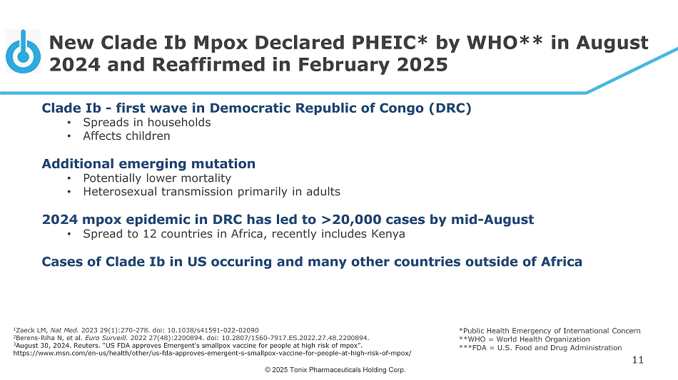 © 2025 Tonix Pharmaceuticals Holding Corp. Mpox Outbreak 2022 - 23: Clade IIb: WHO Public Health Emergency Global Health Concern (PHEIC) 10 Risk of Spread and Lethality of Clade IIb • Case Fatality Rate (CFR): 0.1% to 3.6%  Lower compared to Clade I • Primarily spread through sexual contact among gay men outside Africa • Rapid and significant spread beyond endemic regions  Over 90,000 cases reported in more than 100 countries by the end of 2022 • Systemic symptoms and rash leading to medical interventions in up to 40% of cases Sources: WHO, European CDC, US CDC, and Ministries of Health 2022 U.S. Map and Case Count | Mpox | Poxvirus | CDC WHO = World Health Organization FDA = U.S. Food and Drug Administration Total Cases: 95,912; 92,982 were in locations that have not historically reported Mpox Total Location: 118; 111 has not historically reported Mpox