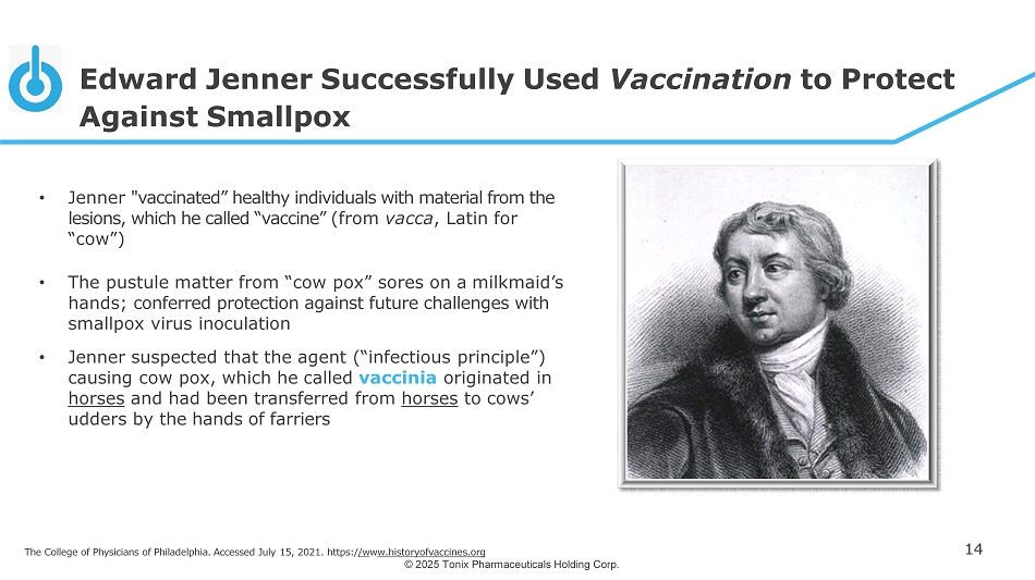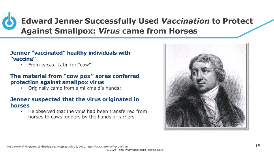 © 2025 Tonix Pharmaceuticals Holding Corp. • Jenner "vaccinated” healthy individuals with material from the lesions, which he called “vaccine” (from vacca , Latin for “cow”) • The p ustule matter from “cow pox” sores on a milkmaid’s hands; conferred protection against future challenges with smallpox virus inoculation • Jenner suspected that the agent (“infectious principle”) causing cow pox, which he called vaccinia originated in horses and had been transferred from horses to cows’ udders by the hands of farriers Edward Jenner Successfully Used Vaccination to Protect Against Smallpox 14 The College of Physicians of Philadelphia. Accessed July 15, 2021. https:/ /w w w.historyofvaccines.org