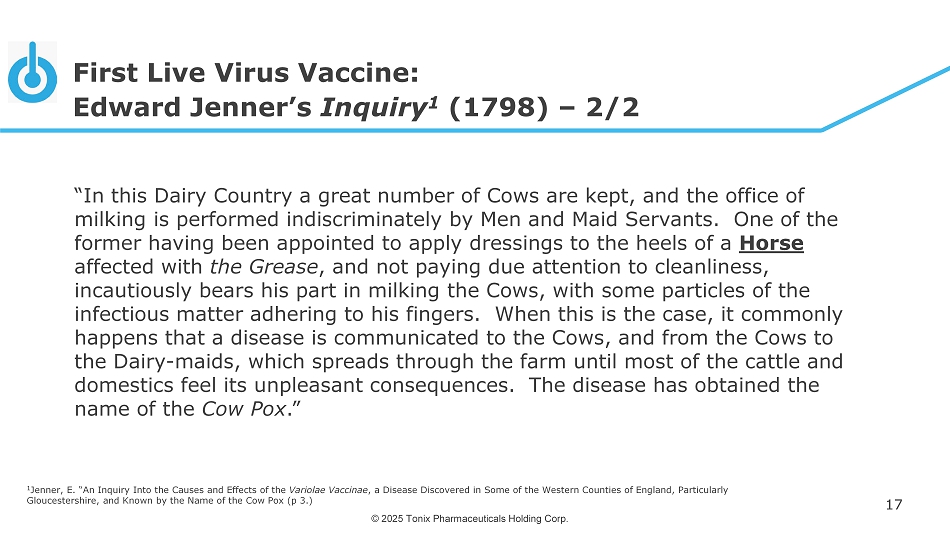 © 2025 Tonix Pharmaceuticals Holding Corp. First Live Virus Vaccine: Edward Jenner’s Inquiry 1 (1798) – 1/2 “There is a disease to which the Horse from his state of domestication is frequently subject. The Farriers have termed it the Grease . It is an inflammation and swelling in the heel, from which issues matter 2 possessing properties of a very peculiar kind, which seems capable of generating a disease in the Human Body (after it has undergone the modification 3 I shall presently speak of), which bears so strong a resemblance to the Small Pox, that I think it highly probable it may be the source of that disease.” 1 Jenner, E. “An Inquiry Into the Causes and Effects of the Variolae Vaccinae , a Disease Discovered in Some of the Western Counties of England, Particularly Gloucestershire, and Known by the Name of the Cow Pox (p 2 - 3.) 2 Vaccine virus 3 Passage in cows 16