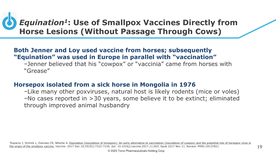 © 2025 Tonix Pharmaceuticals Holding Corp. Loy’s “ Account of some experiments 1 (1801) “This fact induces me to suspect, that two kinds of Grease exist, differing from each other in the power of giving disease to the human or brute animal: and there is another circumstance which renders this supposition probable. The horses that communicated the infection to their dressers, were affected with a general, as well as a topical, disease. The animals, at the commencement of their disease, were evidently in a feverish state, from which they were relived as soon as the complaint appeared at their heels, and an eruption upon their skin. The horse , too, from whom the infectious matter was procured for inoculation, had a considerable indisposition, previous to the disease at his heels, which was attended, as in the others, with an eruption over the greatest part of his body: but those that did not communicate the diseases at all, had a local affection only.” 1 Loy JG. An account of some experiments on the origin of the cow - pox: Whitby; 1801. (p 20 - 21.) 18