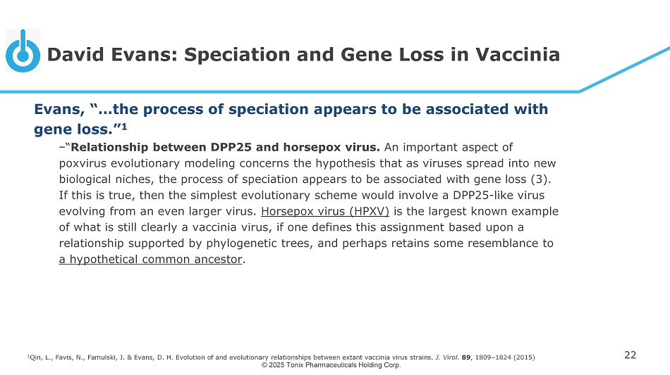 © 2025 Tonix Pharmaceuticals Holding Corp. David Evans: Speciation and Gene Loss in Vaccinia Evans, “…the process of speciation appears to be associated with gene loss.” 1 − “ Relationship between DPP25 and horsepox virus. An important aspect of poxvirus evolutionary modeling concerns the hypothesis that as viruses spread into new biological niches, the process of speciation appears to be associated with gene loss (3). If this is true, then the simplest evolutionary scheme would involve a DPP25 - like virus evolving from an even larger virus. Horsepox virus (HPXV) is the largest known example of what is still clearly a vaccinia virus, if one defines this assignment based upon a relationship supported by phylogenetic trees, and perhaps retains some resemblance to a hypothetical common ancestor . 22 1 Qin, L., Favis , N., Famulski , J. & Evans, D. H. Evolution of and evolutionary relationships between extant vaccinia virus strains. J. Virol . 89 , 1809 – 1824 (2015 )