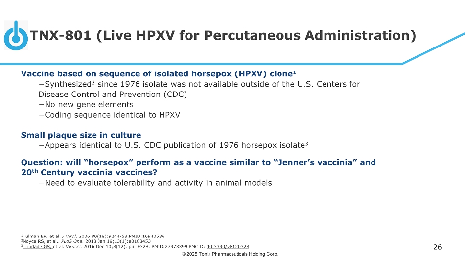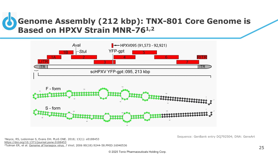 © 2025 Tonix Pharmaceuticals Holding Corp. Genome Assembly (212 kbp ): TNX - 801 Core Genome i s Based on HPXV Strain MNR - 76 1,2 25 Sequence: GenBank entry DQ792504; DNA: GeneArt 1 Noyce, RS, Lederman S, Evans DH. PLoS ONE. 2018; 13(1): e0188453 https://doi.org/10.1371/journal.pone.0188453 2 Tulman ER, et al. Genome of horsepox virus. J Virol ; 2006 80(18):9244 - 58.PMID:16940536
