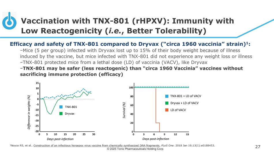 © 2025 Tonix Pharmaceuticals Holding Corp. TNX - 801 (Live HPXV for Percutaneous Administration) 26 Vaccine based on sequence of isolated horsepox (HPXV) clone 1 − Synthesized 2 since 1976 isolate was not available outside of the U.S. Centers for Disease Control and Prevention (CDC) − No new gene elements − Coding sequence identical to HPXV Small plaque size in culture − Appears identical to U.S. CDC publication of 1976 horsepox isolate 3 Question: will “horsepox” perform as a vaccine similar to “Jenner’s vaccinia” and 20 th Century vaccinia vaccines? − Need to evaluate tolerability and activity in animal models 1 Tulman ER, et al. J Virol . 2006 80(18):9244 - 58.PMID:16940536 2 Noyce RS, et al.. PLoS One . 2018 Jan 19;13(1):e0188453 3 Trindade GS , et al. Viruses 2016 Dec 10;8(12). pii : E328. PMID:27973399 PMCID: 10.3390/v8120328