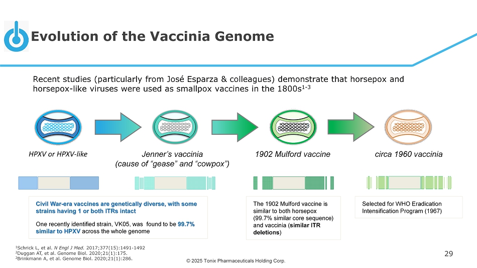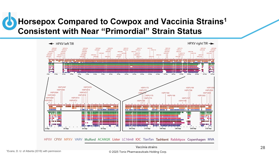 © 2025 Tonix Pharmaceuticals Holding Corp. Horsepox Compared to Cowpox and Vaccinia Strains 1 Consistent with Near “Primordial” Strain Status 28 1 Evans, D. U. of Alberta (2018) with permission