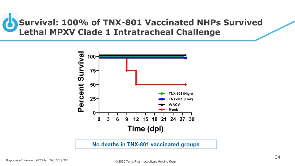© 2025 Tonix Pharmaceuticals Holding Corp. TNX - 801 Immunogenicity and Efficacy in NHPs - 2023 33 Noyce RS, et al. Viruses . 2023 Jan 26;15(2):356. doi : 10.3390/v15020356. PMID: 36851570; PMCID: PMC9965234.