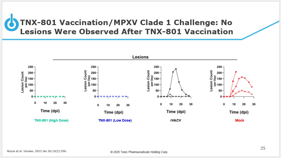 © 2025 Tonix Pharmaceuticals Holding Corp. Survival: 100% of TNX - 801 Vaccinated NHPs Survived Lethal MPXV Clade 1 Intratracheal Challenge 34 No deaths in TNX - 801 vaccinated groups Noyce et al . Viruses. 2023 Jan 26;15(2):356.