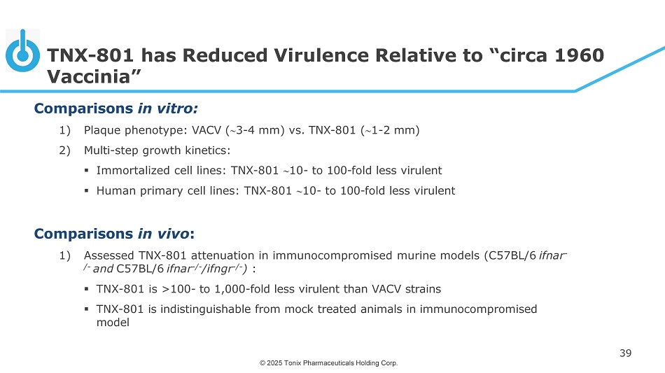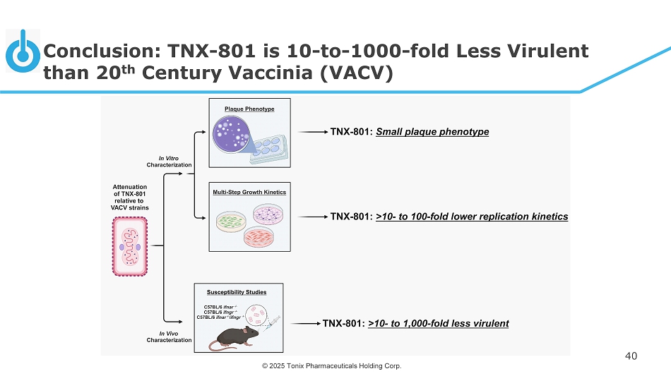 © 2025 Tonix Pharmaceuticals Holding Corp. TNX - 801 has Reduced Virulence Relative to “circa 1960 Vaccinia” 39 Comparisons in vitro: 1) Plaque phenotype: VACV (  3 - 4 mm) vs. TNX - 801 (  1 - 2 mm) 2) Multi - step growth kinetics: ▪ Immortalized cell lines: TNX - 801  10 - to 1 00 - fold less virulent ▪ Human primary cell lines: TNX - 801  10 - to 100 - fold less virulent Comparisons in vivo : 1) Assessed TNX - 801 attenuation in immunocompromised murine models (C57BL/6 ifnar - / - and C57BL/6 ifnar - / - / ifngr - / - ) : ▪ TNX - 801 is >100 - to 1,000 - fold less virulent than VACV strains ▪ TNX - 801 is indistinguishable from mock treated animals in immunocompromised model