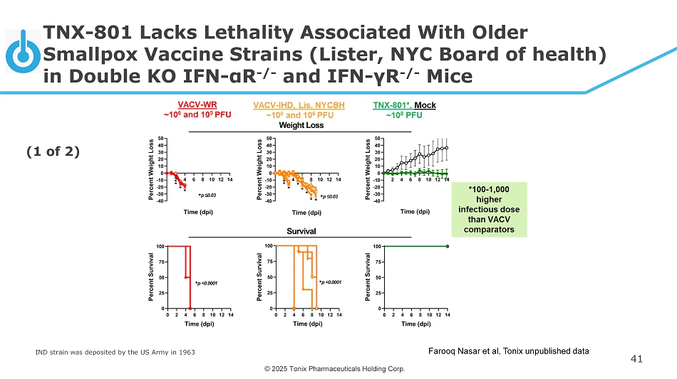 © 2025 Tonix Pharmaceuticals Holding Corp. Conclusion: TNX - 801 is 10 - to - 1000 - fold Less Virulent than 20 th Century Vaccinia (VACV) 40