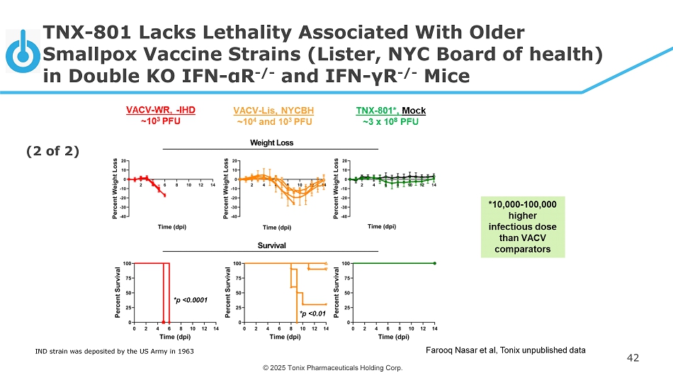 © 2025 Tonix Pharmaceuticals Holding Corp. TNX - 801 Lacks Lethality Associated With Older Smallpox Vaccine Strains (Lister, NYC Board of health) in Double KO IFN - α R - / - and IFN - γ R - / - Mice 41 IND strain was deposited by the US Army in 1963 Farooq Nasar et al, Tonix unpublished data (1 of 2)