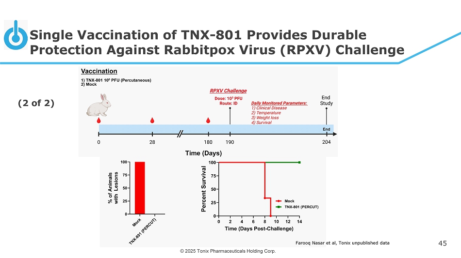 © 2025 Tonix Pharmaceuticals Holding Corp. Single Vaccination of TNX - 801 Provides Durable Protection Against Rabbitpox Virus (RPXV) Challenge 45 Farooq Nasar et al, Tonix unpublished data (2 of 2)