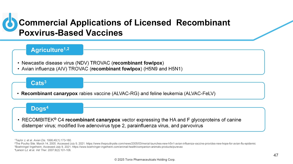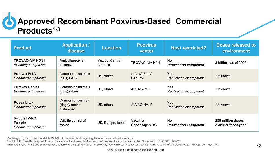 © 2025 Tonix Pharmaceuticals Holding Corp. Commercial Applications of Licensed Recombinant Poxvirus - Based Vaccines 47 1 Taylor J, et al. Avian Dis. 1996;40(1):173 - 180. 2 The Poultry Site. March 14, 2005. Accessed July 9, 2021. https://www.thepoultrysite.com/news/2005/03/merial - launches - new - h5n1 - av ian - influenza - vaccine - provides - new - hope - for - avian - flu - epidemic 3 Boehringer Ingelheim. Accessed July 9, 2021. https://www.boehringer - ingelheim.com/animal - health/companion - animals - products/purev ax 4 Larson LJ, et al. Vet Ther. 2007;8(2):101 - 106. • Newcastle disease virus (NDV) TROVAC ( recombinant fowlpox ) • Avian influenza (AIV) TROVAC ( recombinant fowlpox ) (H5N9 and H5N1) Agriculture 1,2 • Recombinant canarypox rabies vaccine (ALVAC - RG) and feline leukemia (ALVAC - FeLV) Cats 3 • RECOMBITEK ® C4 recombinant canarypox vector expressing the HA and F glycoproteins of canine distemper virus; modified live adenovirus type 2, parainfluenza virus, and parvovirus Dogs 4