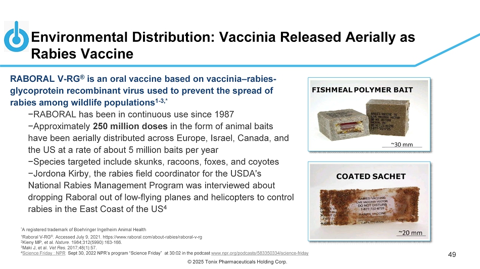 © 2025 Tonix Pharmaceuticals Holding Corp. Approved Recombinant Poxvirus - Based Commercial Products 1 - 3 48 Doses released to environment Host restricted? Poxvirus vector Location Application / disease Product 2 billion (as of 2006) No Replication competent TROVAC - AIV H5N1 Mexico, Central America Agriculture/avian influenza TROVAC - AIV H5N1 Boehringer Ingelheim Unknown Yes Replication incompetent ALVAC - FeLV Gag/Pol US, others Companion animals (cats)/FeLV Purevax FeLV Boehringer Ingelheim Unknown Yes Replication incompetent ALVAC - RG US, others Companion animals (cats)/rabies Purevax Rabies Boehringer Ingelheim Unknown Yes Replication incompetent ALVAC - HA, F US, others Companion animals (dogs)/canine distemper Recombitek Boehringer Ingelheim 250 million doses 5 million doses/year No Replication competent Vaccinia Copenhagen RG US, Europe, Israel Wildlife control of rabies Raboral V - RG Rabisin Boehringer Ingelheim 1 Boehringer Ingelheim. Accessed July 15, 2021. https://www.boehringer - ingelheim.com/animal - health/products 2 Bublot M, Pritchard N, Swayne DE, et al. Development and use of fowlpox vectored vaccines for avian influenza. Ann N Y Acad Sci . 2006;1081:193 - 201. 3 Maki J, Guiot AL, Aubert M, et al. Oral vaccination of wildlife using a vaccinia - rabies - glycoprotein recombinant virus vaccine (RABORAL V - RG ® ): a global review. Vet Res . 2017;48(1):57.