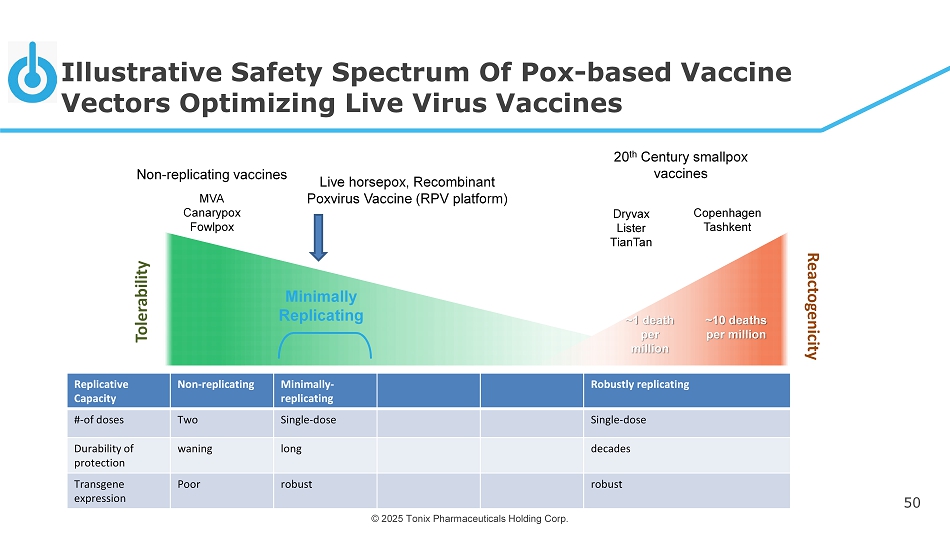 © 2025 Tonix Pharmaceuticals Holding Corp. Illustrative Safety Spectrum Of Pox - based Vaccine Vectors Optimizing Live Virus Vaccines 50 ~1 death per million ~10 deaths per million 20 th Century smallpox vaccines Dryvax Lister TianTan Copenhagen Tashkent MVA Canarypox Fowlpox Minimally Replicating Live horsepox, Recombinant Poxvirus Vaccine ( RPV platform ) Robustly replicating Minimally - replicating Non - replicating Replicative Capacity Single - dose Single - dose Two # - of doses decades long waning Durability of protection robust robust Poor Transgene expression Non - replicating vaccines Tolerability Reactogenicity