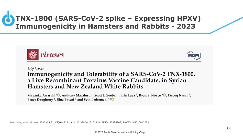 © 2025 Tonix Pharmaceuticals Holding Corp. TNX - 1800 (SARS - CoV - 2 spike – Expressing HPXV) Immunogenicity in Hamsters and Rabbits - 2023 54 Awasthi M, et al. Viruses . 2023 Oct 21;15(10):2131. doi : 10.3390/v15102131. PMID: 37896908; PMCID: PMC10612059.