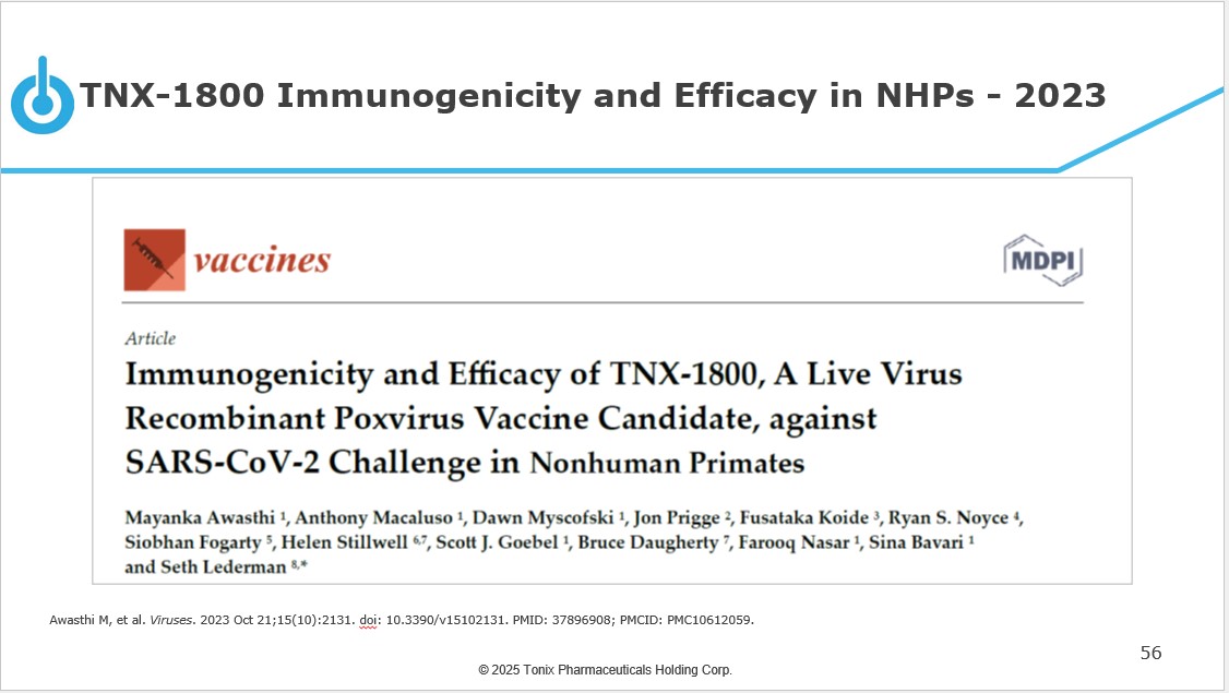 © 2025 Tonix Pharmaceuticals Holding Corp. TNX - 1800 Immunogenicity and Efficacy in NHPs - 2023 56 Awasthi M, et al. Viruses . 2023 Oct 21;15(10):2131. doi : 10.3390/v15102131. PMID: 37896908; PMCID: PMC10612059.
