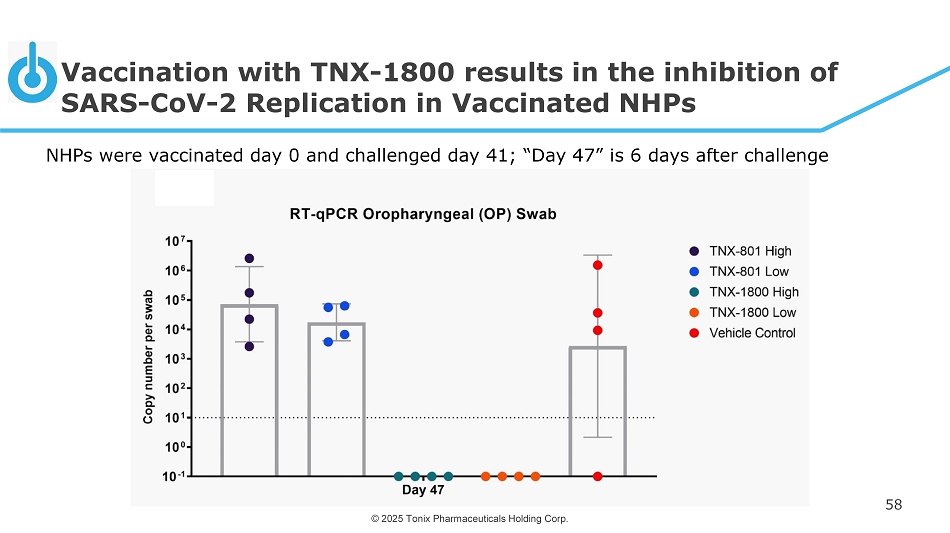 © 2025 Tonix Pharmaceuticals Holding Corp. Vaccination with TNX - 1800 results in the inhibition of SARS - CoV - 2 Replication in Vaccinated NHPs 58 NHPs were vaccinated day 0 and challenged day 41; “Day 47” is 6 days after challenge