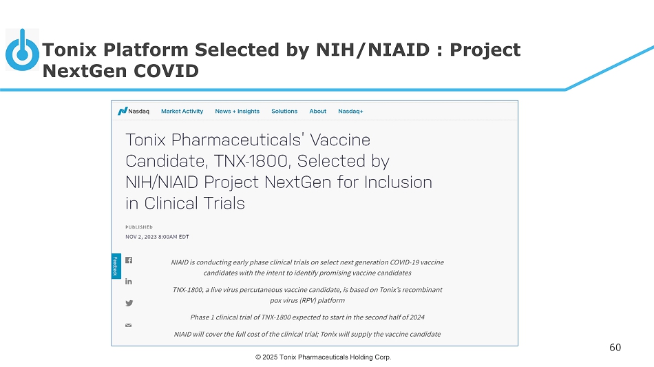 © 2025 Tonix Pharmaceuticals Holding Corp. Tonix Platform Selected by NIH/NIAID : Project NextGen COVID 60
