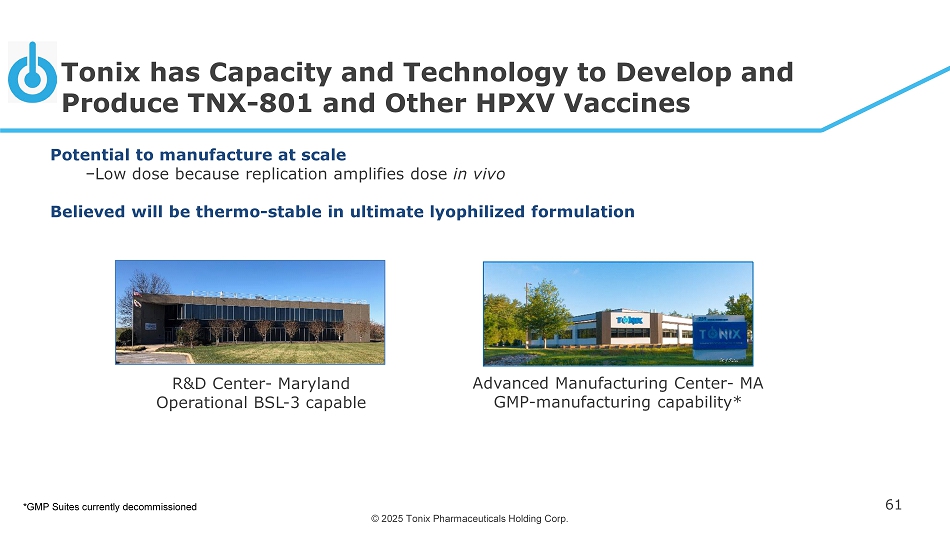 © 2025 Tonix Pharmaceuticals Holding Corp. Tonix has Capacity and Technology to Develop and Produce TNX - 801 and Other HPXV Vaccines 61 Potential to manufacture at scale − Low dose because replication amplifies dose in vivo Believed will be thermo - stable in ultimate lyophilized formulation R&D Center - Maryland Operational BSL - 3 capable Advanced Manufacturing Center - MA GMP - manufacturing capability* *GMP Suites currently decommissioned