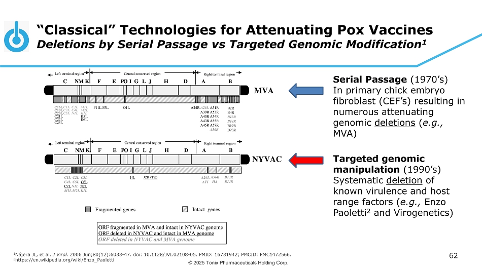 © 2025 Tonix Pharmaceuticals Holding Corp. “Classical” Technologies for Attenuating Pox Vaccines Deletions by Serial Passage vs Targeted Genomic Modification 1 62 Targeted genomic manipulation ( 1990’s) Systematic deletion of known virulence and host range factors ( e.g., Enzo Paoletti 2 and Virogenetics ) Serial Passage (1970’s) In primary chick embryo fibroblast (CEF’s) r esulting in numerous attenuating genomic deletions ( e.g., MVA) 1 Nájera JL, et al. J Virol . 2006 Jun;80(12):6033 - 47. doi : 10.1128/JVI.02108 - 05. PMID: 16731942; PMCID: PMC1472566. 2 https://en.wikipedia.org/wiki/ Enzo_Paoletti