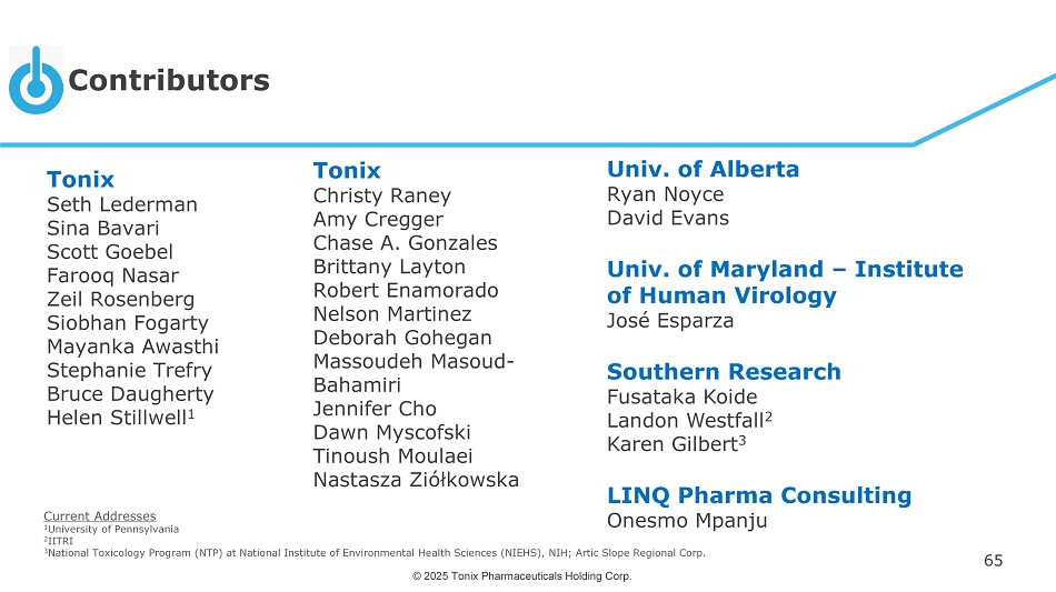 © 2025 Tonix Pharmaceuticals Holding Corp. Contributors 65 Tonix Christy Raney Amy Cregger Chase A. Gonzales Brittany Layton Robert Enamorado Nelson Martinez Deborah Gohegan Massoudeh Masoud - Bahamiri Jennifer Cho Dawn Myscofski Tinoush Moulaei Nastasza Ziółkowska Current Addresses 1 University of Pennsylvania 2 IITRI 3 National Toxicology Program (NTP) at National Institute of Environmental Health Sciences (NIEHS), NIH; Artic Slope Regional C orp . Univ. of Alberta Ryan Noyce David Evans Univ. of Maryland – Institute of Human Virology José Esparza Southern Research Fusataka Koide Landon Westfall 2 Karen Gilbert 3 LINQ Pharma Consulting Onesmo Mpanju Tonix Seth Lederman Sina Bavari Scott Goebel Farooq Nasar Zeil Rosenberg Siobhan Fogarty Mayanka Awasthi Stephanie Trefry Bruce Daugherty Helen Stillwell 1