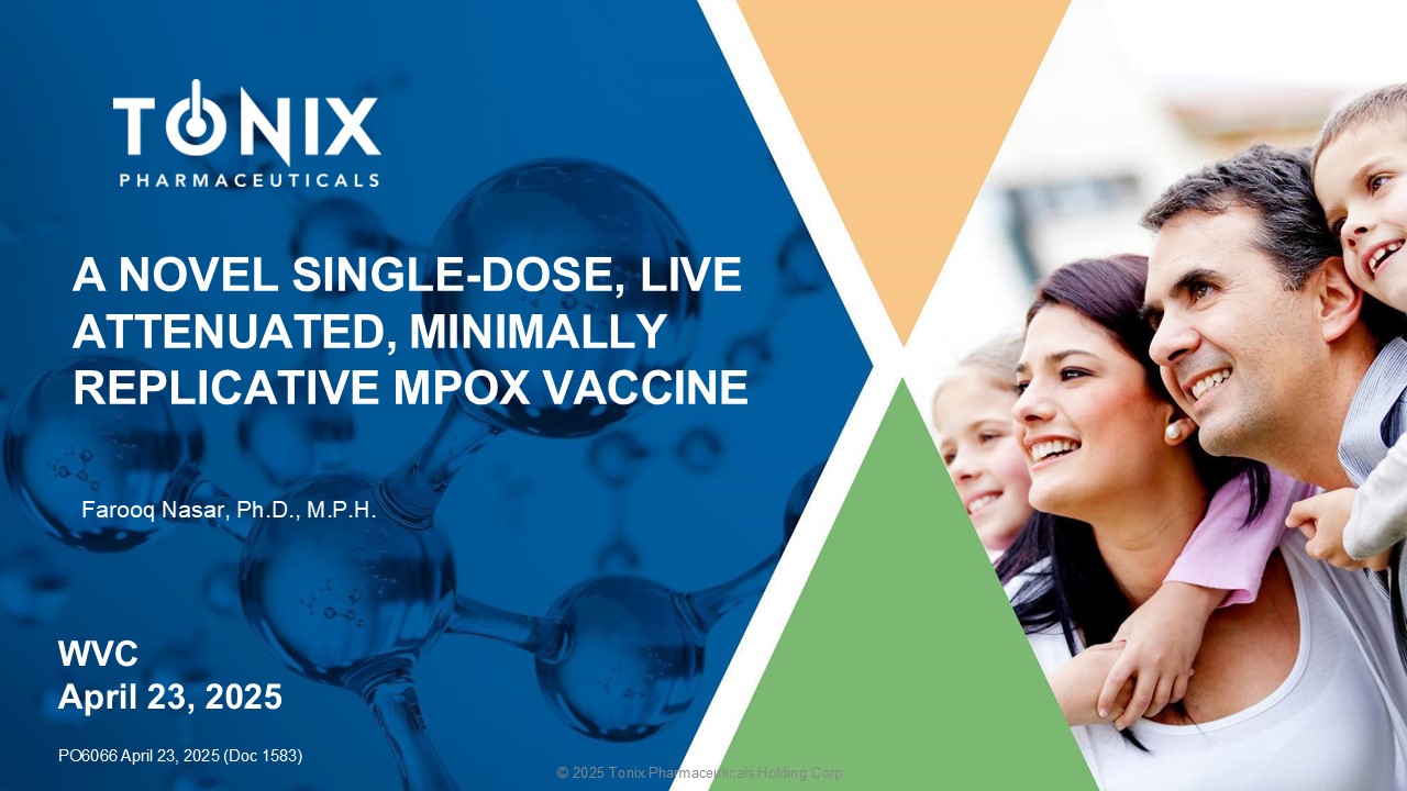 A NOVEL SINGLE - DOSE, LIVE ATTENUATED, MINIMALLY REPLICATIVE MPOX VACCINE Farooq Nasar, Ph.D., M.P.H. WVC April 23, 2025 PO6066 April 23, 2025 (Doc 1583) © 2025 Tonix Pharmaceuticals Holding Corp.
